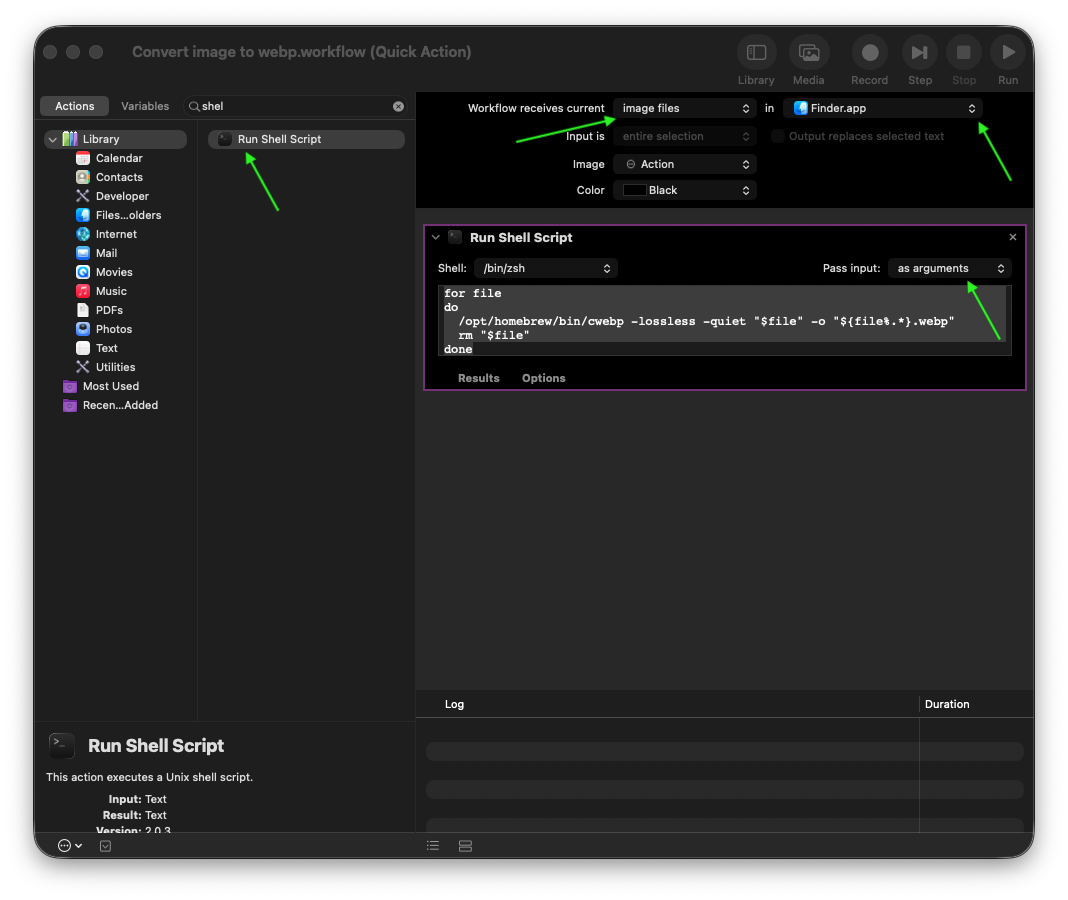 Save this Quick Action as “Convert image to webp”.